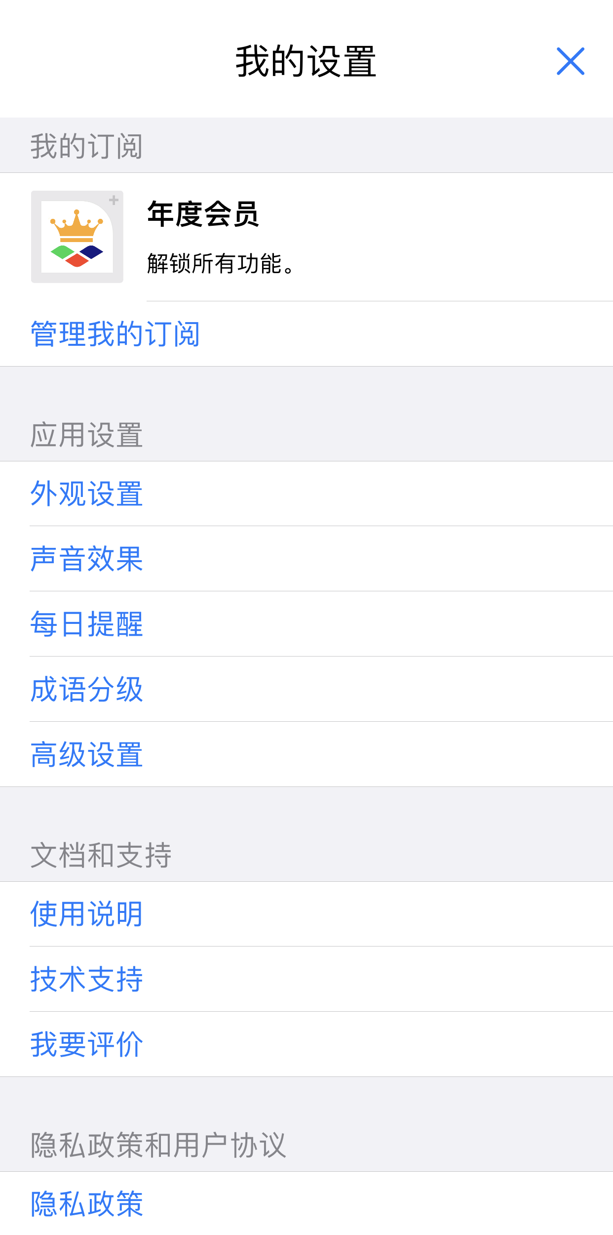 需要订阅的功能:字母5x5方格;成语4x4方格;成语6x6方格;包括数字方格在内的所有方格类型的高级模式设置(包括记忆模式)、形状设置、颜色设置、顺序设置; 成就徽章;触控反馈;表格大小调整(五档微调);家庭共享(单个订阅购买可以被最多六位家庭成员的苹果手机或平板使用)
